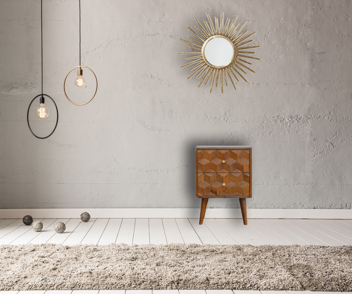 The main feature of this nightstand is the hand carved cube drawer fronts which make the pieces from this collection stand out. It has been constructed from 100% solid mango wood in a chestnut finish and stands on 4 Nordic style legs. It can be partnered with the other pieces from the range or stand individually as its style is versatile and can fit into different types of interiors.