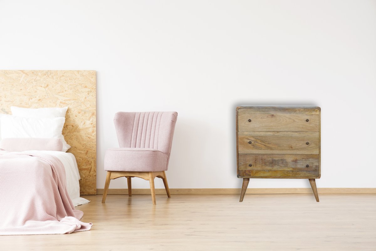 To match the other products from the curved collection, this chest of drawers has been constructed from 100% solid mango wood in a fine oakish finish and stands on 4 Nordic style legs. It features 2 shiny accent knobs on each drawer providing easy access when storing any clothes, towels, duvets etc. The curved design provides smooth, safe corners and gives the product a modern and contemporary look which is perfect for city homes and apartments.